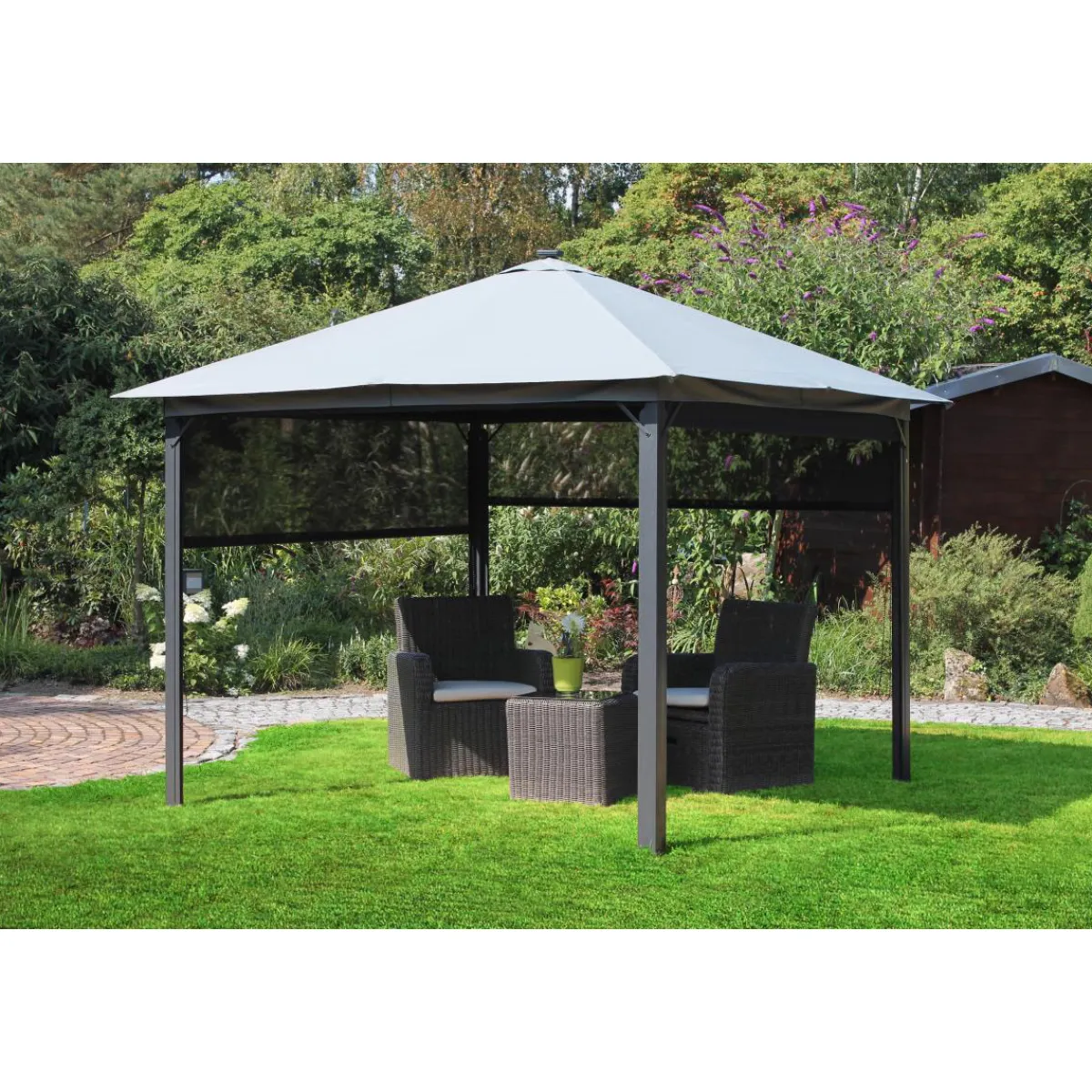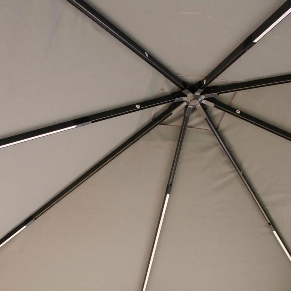 Dieser Solarpavillon ist äußerst standfest und verfügt über 4 stufenlos verstellbare Rollos. Diese sind aus Textilengewebe gefertigt und bieten dadurch Schutz vor Wind und gleichzeitig die Sicht nach außen. In den 8 Dachstreben sind Leuchtstäbe integriert, die mit einem Ein- und Ausschalter in 2 Helligkeitsstufen reguliert und sowohl mit Solar als auch mit Strom betrieben werden können.