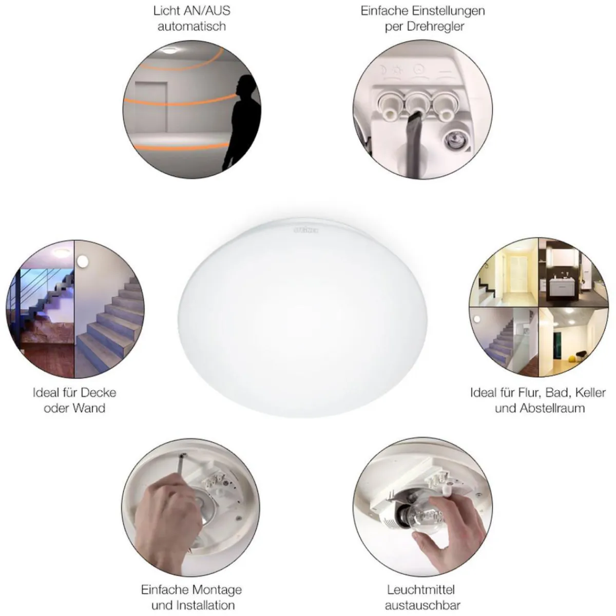 Die Steinel Deckenleuchte mit Bewegungsmelder RS 16 S E27 eignet sich ideal für alle Kunden, die eine zuverlässige und funktionale Beleuchtung suchen. Ob im Wohnzimmer oder Schlafzimmer – diese Lampe sorgt immer für das passende Licht.