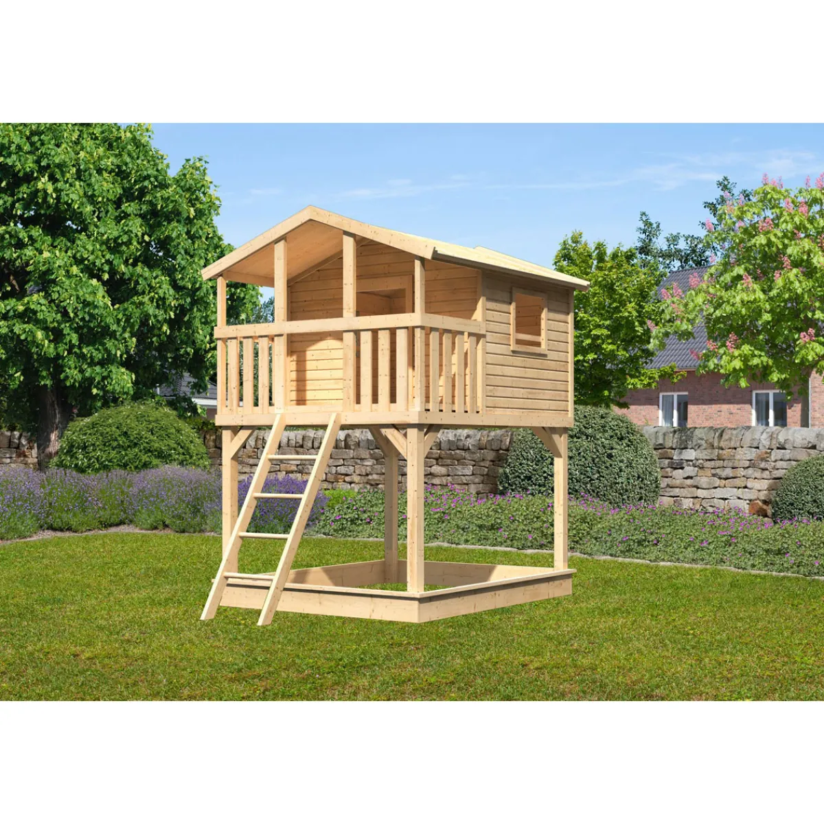 Dieses Stelzenhaus aus 19 mm starken Wandbrettern mit einer Podesthöhe von 150 cm beflügelt die Fantasie Ihrer Kinder. 4 Massivholzpfosten mit einer Stärke von 90×90 mm und Terrassen vor dem Haus mit Brüstung sorgen für viel Sicherheit für Ihre Kleinen. Im Lieferumfang ist eine Holzleiter enthalten, die den Zugang zur Terrasse vereinfacht. Das Außenmaß dieses Hauses beträgt 198x244x309 cm und bietet somit unglaublich viel Platz um die Fantasie anzukurbeln. Das Haus wird mit einem Satteldach aus Massivholzdach geschützt. Die 6 m² große Dachfläche bietet auch der Terrasse noch Schutz und sorgt für unbeschwertes Spielvergnügen, egal zu welcher Jahreszeit. Unsere Stelzenhäuser bieten mit einer Rutsche in vielen Farben sowie weiterem umfangreichem Zubehör alles, was das Kinderherz begehrt.