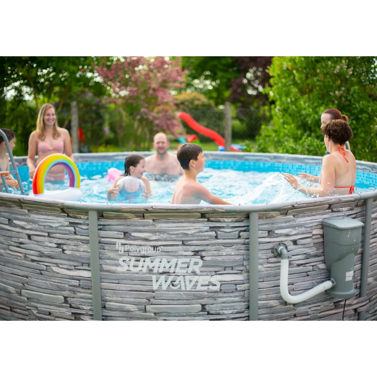 Summer Waves Elite Frame Pool Aufstellpool rund Komplettset Steinoptik Ø 427×107 cm Abkühlung, Erfrischung und Poolspaß ohne Ende — klingt das nicht hervorragend? Der Elite Frame Pool von Summer Waves punktet mit umfangreicher Ausstattung und zuverlässiger Qualität. Verwandele deinen Garten mit dem runden Aufstellpool und wenig Aufwand in ein sommerliches Poolparadies! Unkomplizierter Aufbau für schnellen Poolspaß! Durch das innovative Snap-in System ist der Pool im Nu aufgebaut. Die hochwertigen Rahmenrohre aus Metall gewährleisten in Verbindung mit der strapazierfähigen Poolfolie aus einem 3-lagigen PVC-Polyester-Mix Langlebigkeit und Stabilität. Die Highlights auf einen Blick: * Komplettset mit exklusivem Zubehör! * Robuste Poolkonstruktion für langanhaltenden Badespaß * Maximale Stabilität durch massive Stahlrohr-Konstruktion * Hohe Belastbarkeit dank 3-lagiger PVC-Polyester-Mix Folie * Schneller und einfacher Aufbau durch Snap-in Verfahren * Füllmenge bei 90 % 13.294 Liter Platz für ca. 6 Personen * Attraktives Design in Steinoptik kombiniert mit Mosaikmuster Maximale Sauberkeit dank zuverlässiger Technologie! Die mitgelieferte SkimmerPlus 2-in-1 Filterpumpe reinigt das Wasser effektiv und sorgt für klare Verhältnisse. Oberflächenablagerungen werden kontinuierlich durch die Abschöpftechnologie entfernt, sodass du den ganzen Sommer über kristallklares Wasser genießen kannst. Im Lieferumfang enthalten: * SkimmerPlus Filterpumpe mit Filterpatrone * Einstiegsleiter * Abdeckplane und Bodenvlies * Deluxe-Reinigungsset Erlebe maximalen Badespaß, Abkühlung pur und unvergessliche Sommermomente mit dem Summer Waves Elite Frame Pool!