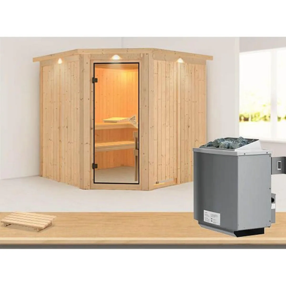 Erleben Sie pure Entspannung in der Karibu Systemsauna Jarin. Die hochwertige nordische Fichte und der leistungsstarke Ofen sorgen für ein unvergleichliches Saunaerlebnis.