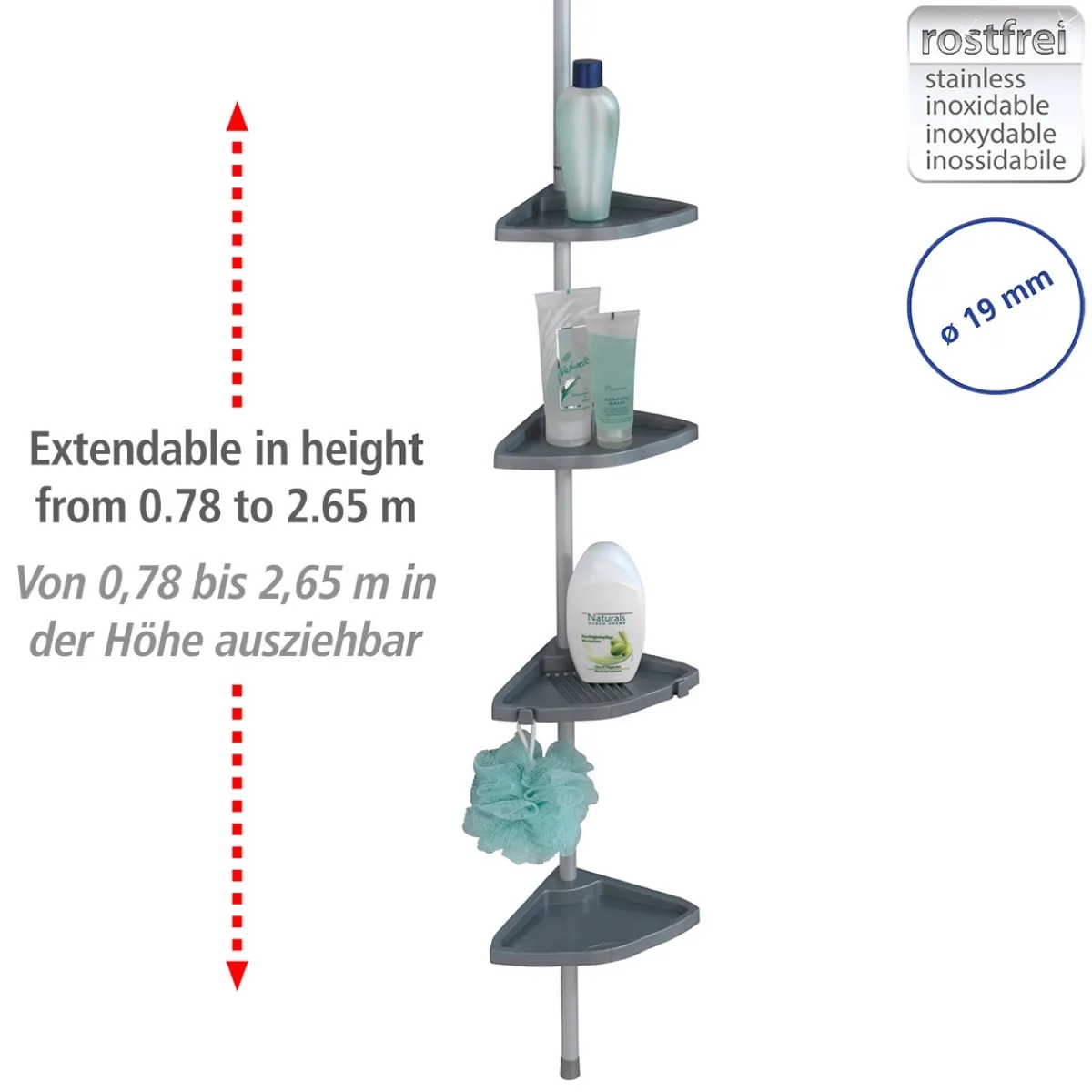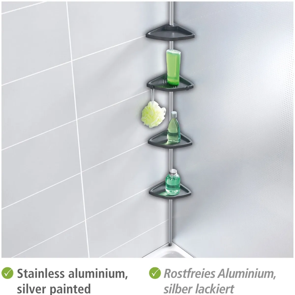 Schaffen Sie mehr Platz in Ihrer Dusche und organisieren Sie Ihre Pflegeprodukte mit der Wenko Teleskop Duschecke Easy Silber. Das Bad-Regal bietet vier Ablagen aus Polystyrol und ist einfach zu montieren.