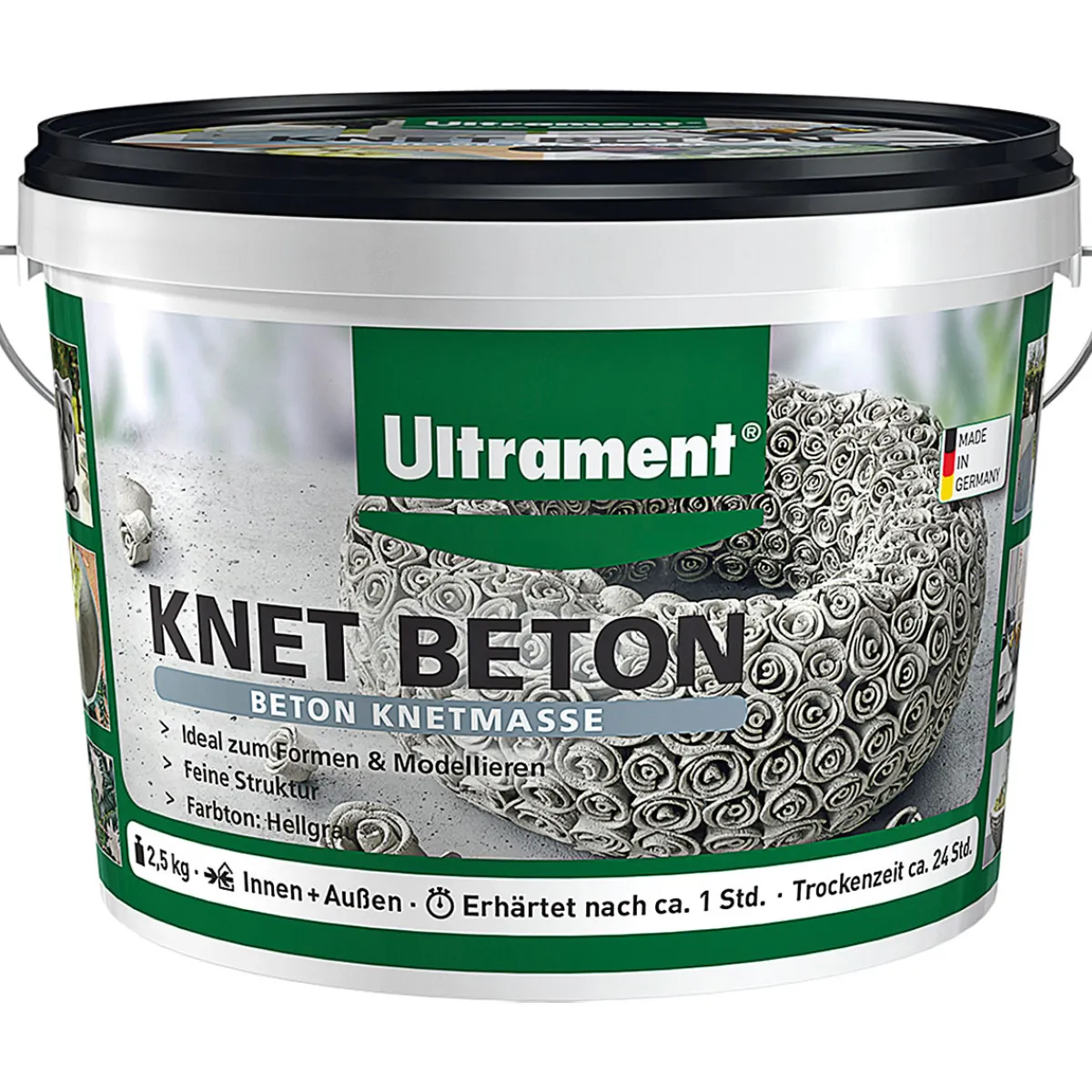Mit Ultrament Knet-Beton können Sie Ihre eigenen Ideen verwirklichen und einzigartige Dekorationsartikel kreieren. Die schnelle Trocknungszeit von nur ca. 60 Minuten ermöglicht es Ihnen, schnell Ergebnisse zu erzielen. Zudem ist das Material feuchtigkeits- und frostbeständig sowie wasserundurchlässig, reißfest und schrumpffrei. Beachten Sie jedoch die Gefahrenhinweise auf der Verpackung bezüglich Hautreizungen oder Augenschäden. Mit einer Verbrauchsreichweite von ca. 2,05 kg/dm³ haben Sie ausreichend Material zur Verfügung um viele tolle Projekte zu realisieren.