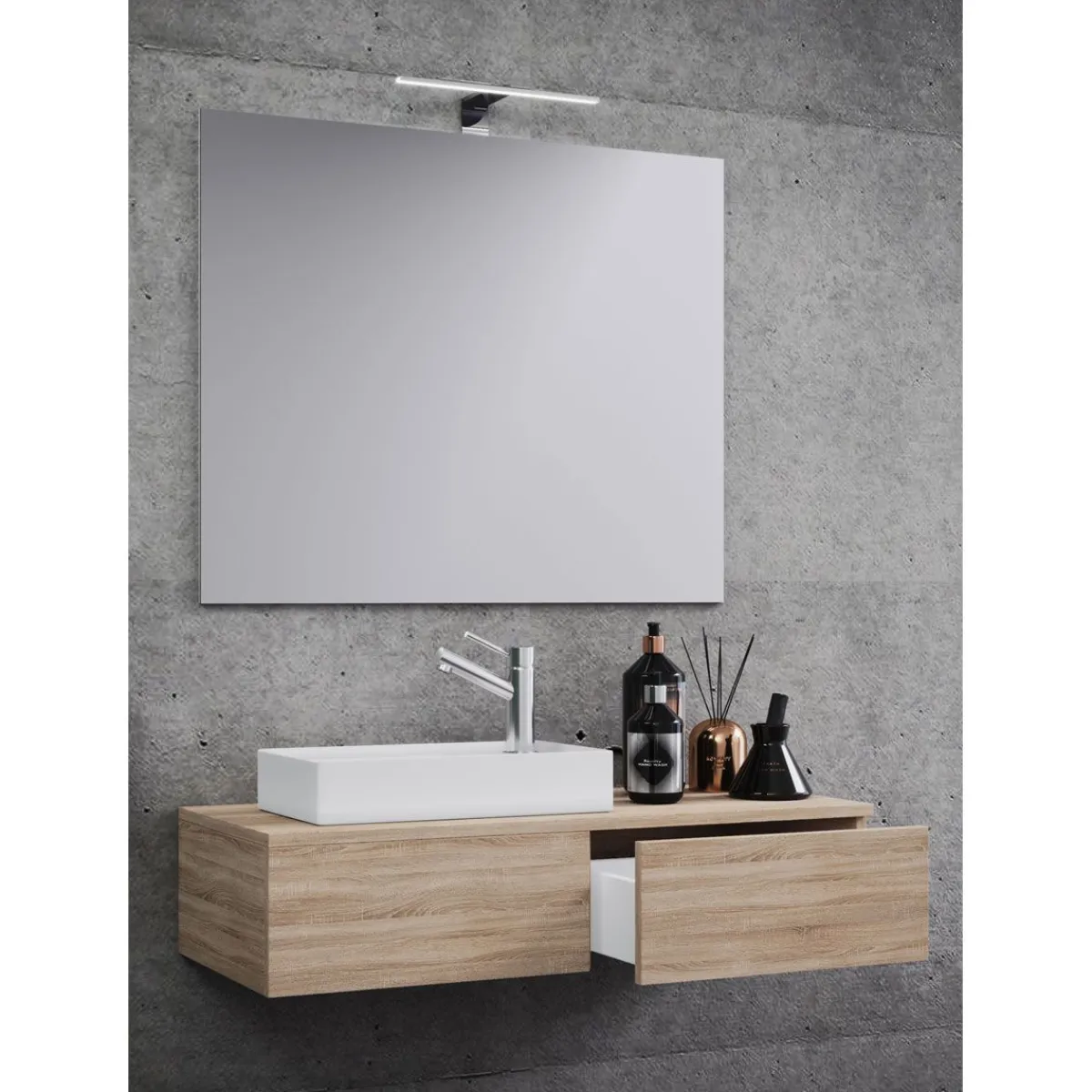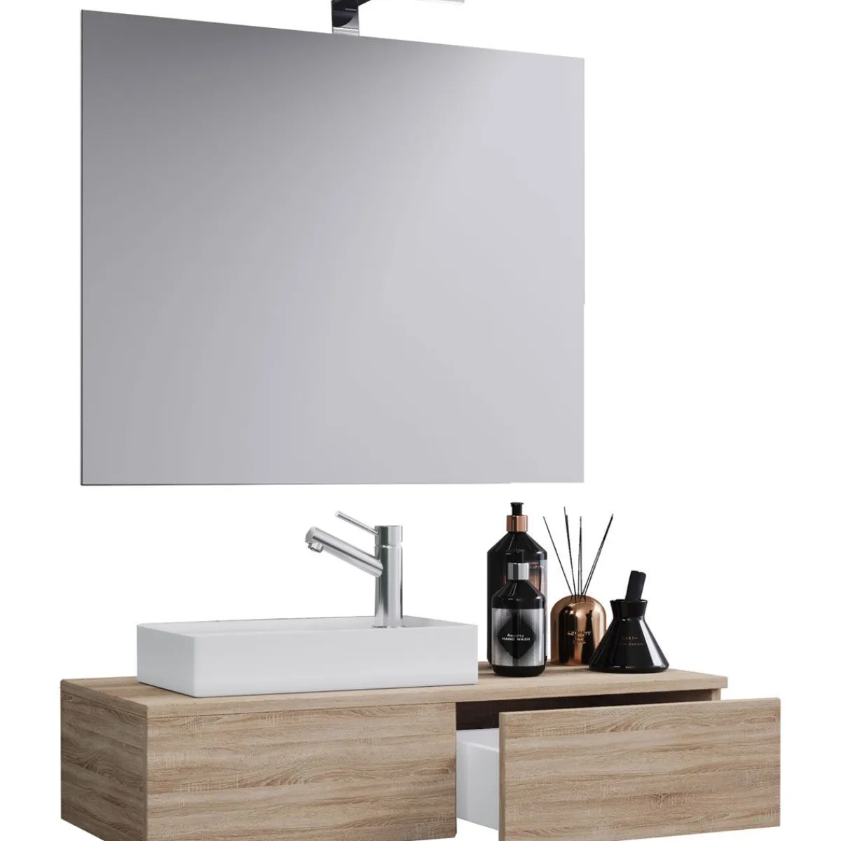 – 1x Spiegel aus strapazierfähigem Glas Der Waschplatz ist ein kleines Raumwunder. Das Set besteht aus einem Spiegel und einem Waschbecken mit Waschbeckenunterschrank. Eine sehr elegante Einrichtungslösung für WCs oder Gästetoiletten, um ein optisches Highlight zu setzen. Waschtisch-Unterschrank: