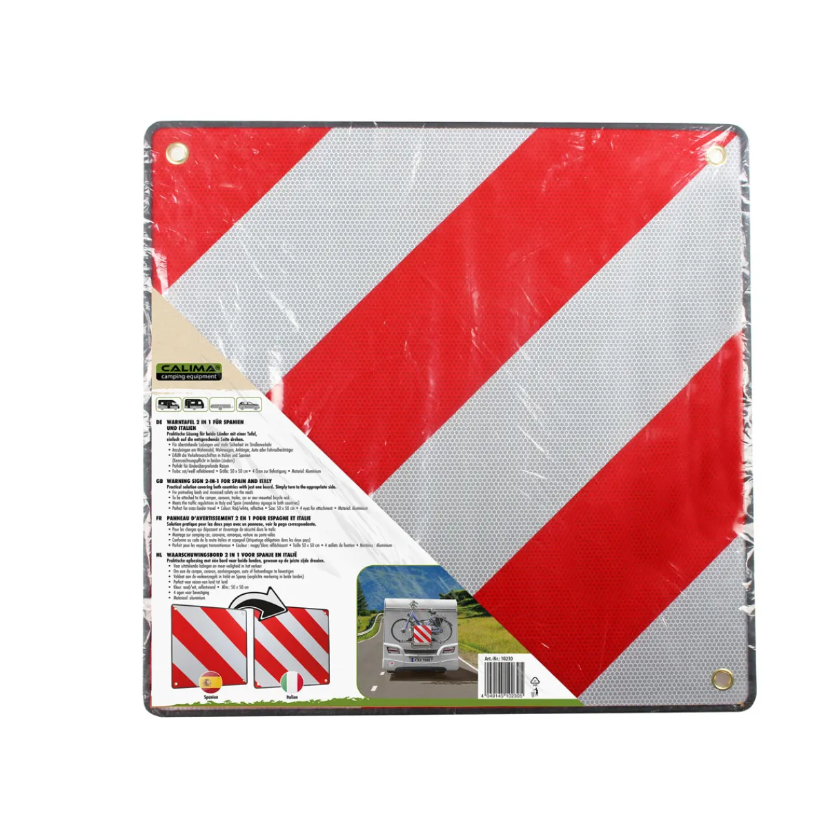 Verwendbar in Italien und Spanien – einfach dem Land entsprechend umdrehen – für überstehende Lasten. Mit 4 Ösen zum Befestigen. Größe: 50 x 50 cm.