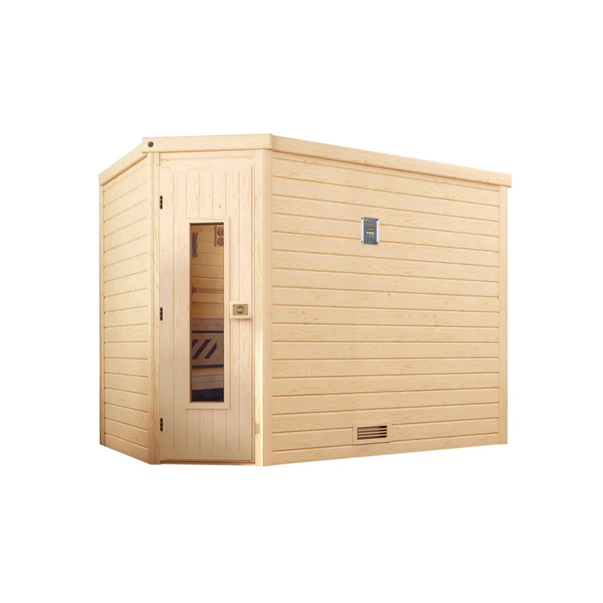 Produktdetails der Weka Design-Sauna Cubilis Größe 2 Sparset 7,5kW Bio S Glastür und Fenster