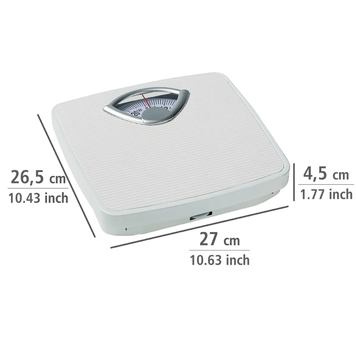 Die Wenko Wenko Personenwaage ist eine mechanische analoge Körperwaage mit einer max. Belastbarkeit von 130 kg. Das Gehäuse besteht aus Metall und die Trittfläche aus Kunststoff. Die Waage ist in Weiß erhältlich und wird ohne Batterien geliefert.