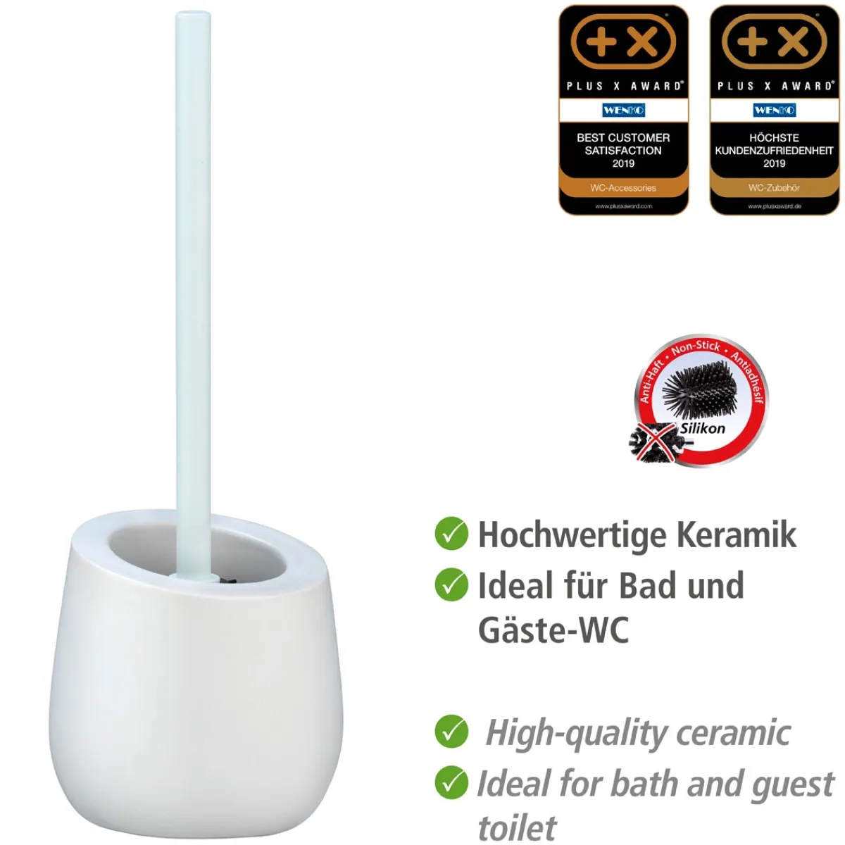 Wer eine hochwertige und zugleich stilvolle Lösung für sein Bad sucht, trifft mit der Wenko WC-Garnitur Badi definitiv die richtige Wahl. Die Kombination aus robustem Keramikmaterial und dem freistehenden Design machen sie zu einem echten Blickfang in jedem Bad. Zudem überzeugt sie durch ihre einfache Handhabung und Reinigungsmöglichkeiten.