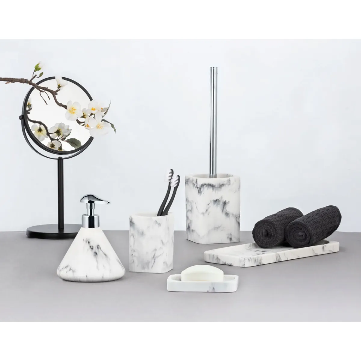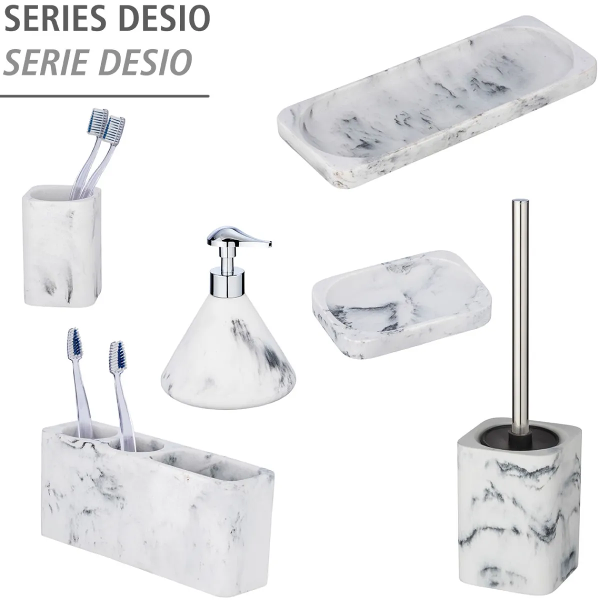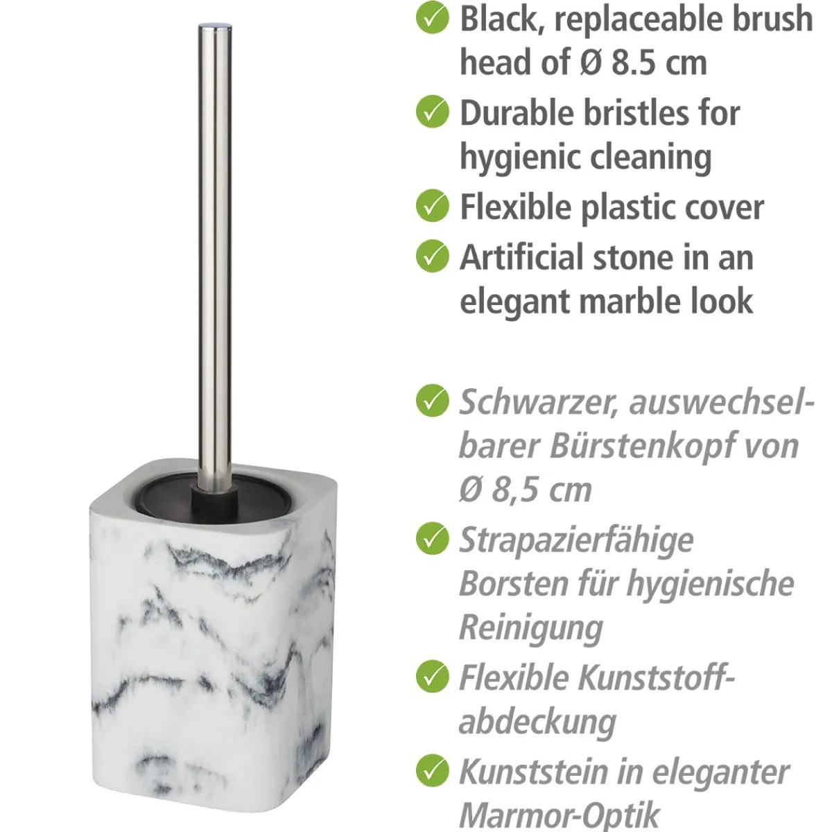 Mit der Wenko Desio WC-Garnitur holen Sie sich stilvolle Eleganz in Ihr Badezimmer. Das Standmodell aus Polyresin besticht durch sein edles Marmor-Design und die eckige Form.