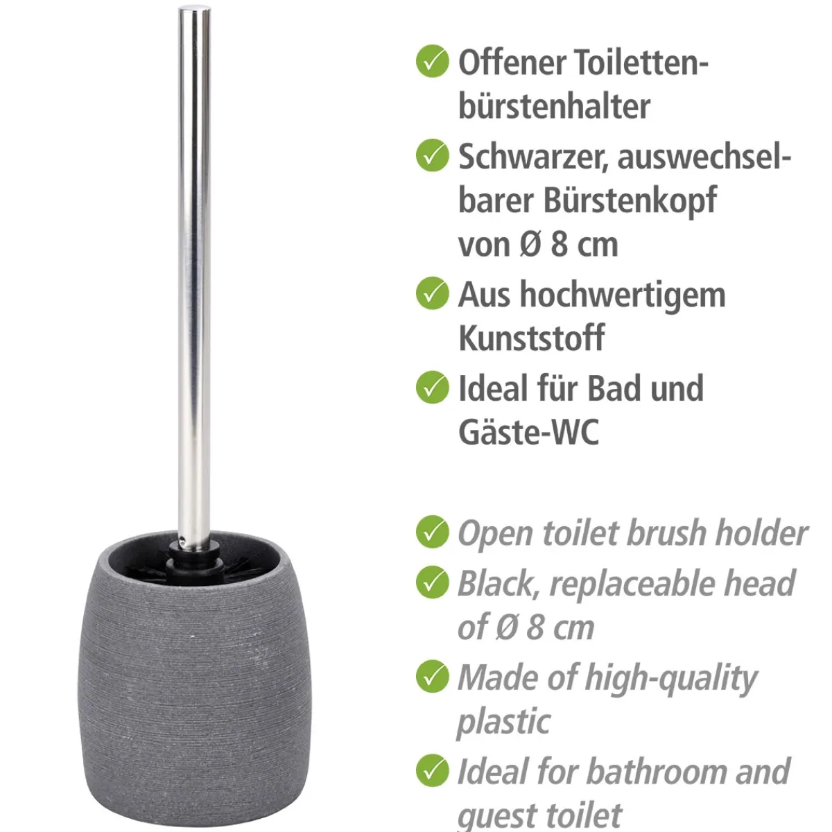Mit der Wenko WC-Garnitur Goa Grau erhalten Sie eine stilvolle und praktische Ergänzung für Ihr Badezimmer. Das hochwertige Material Polyresin sorgt dafür, dass die Garnitur besonders langlebig ist. Dank des freistehenden Designs lässt sie sich einfach platzieren und reinigen. Wir empfehlen Ihnen daher diese tolle Garnitur von WENKO!