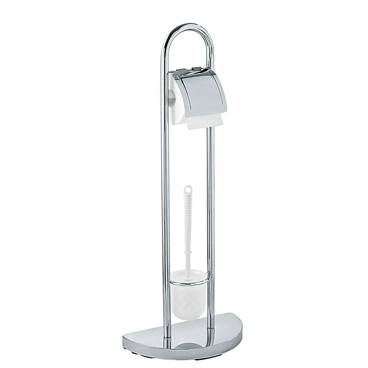 Die Wenko WC-Garnitur Raumwunder ist die perfekte Lösung für kleine Badezimmer. Mit ihrem geschlossenen Design bietet sie Platz für Toilettenpapier und eine WC-Bürste in einem. Der chromfarbene Stahlrahmen und der weiße Behälter aus Polypropylen passen zu jedem Badezimmerstil.