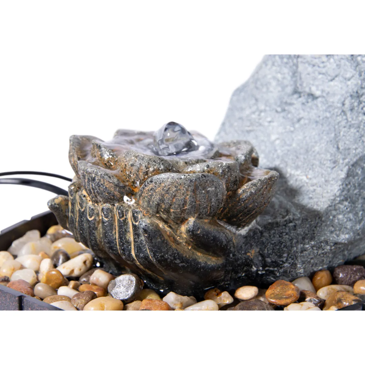 - Dekorative Ziersteine verstärken das natürliche Flair des Brunnens und sorgen für zusätzliche visuelle Akzente